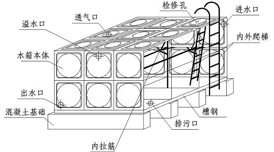 設(shè)計(jì)階段根據(jù)客戶的需求和工地現(xiàn)場(chǎng)情況,對(duì)不銹鋼水箱的大?。▏崝?shù))、尺寸(長(zhǎng)寬高)、不銹鋼板厚度(底板、側(cè)板、頂板、(保溫棉、外包板))、內(nèi)部拉筋、人孔、進(jìn)水口、出水口、基礎(chǔ)、槽鋼底座等進(jìn)行設(shè)計(jì)。給出合理的設(shè)計(jì)方案,爭(zhēng)取做到力學(xué)結(jié)構(gòu)合理、節(jié)省成本、使用方便。